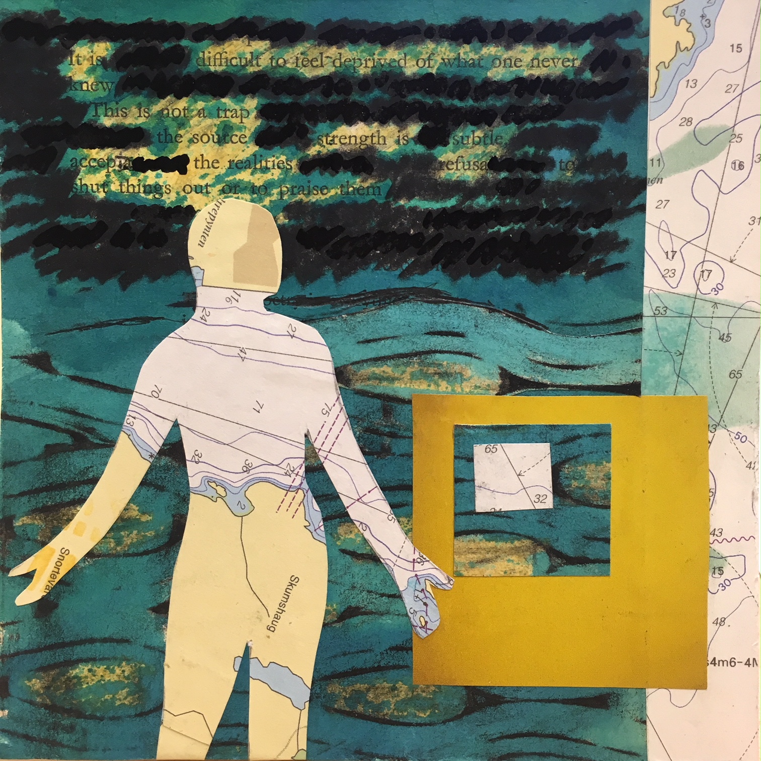 Redacting text lives high on my list of techniques for manipulating words, whether found or my own. I don’t remember the origins of the text for today’s collage. Here’s the new text.