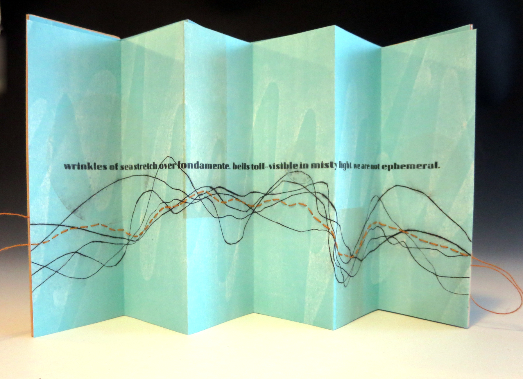 In We Are Not Ephemeral I continued my need to follow the weather while in Venice by watching the tide charts. During my first ten days I experienced acqua alta a couple of times—nothing too impressive, but enough to warrant rubber boots in a few places. This books considers the ebb and flow of relationships and the desire for them to not be ephemeral. It’s a simple accordion book made from pressure printing, dry point, handset type and a hand-stitched pathway.