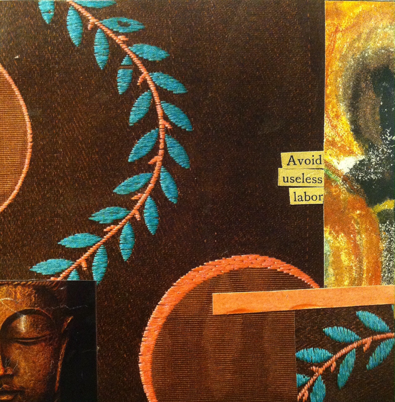 The part where the celebrant prays to “protect us from all anxiety” was always my favorite line. There was one priest, I think he had been a former Army chaplain, who used to say mass occasionally at Saint Raphael’s in Williamstown. He always, without fail, altered that prayer to this: Protect us from all useless anxiety, with extra emphasis on the useless part. It simultaneously cracked me up, and inspired me. Today’s collage, while slightly different, is made with that intention in mind. May we all be protected from useless anxiety, useless labor, useless whatever.