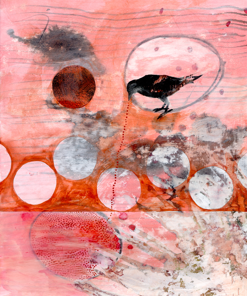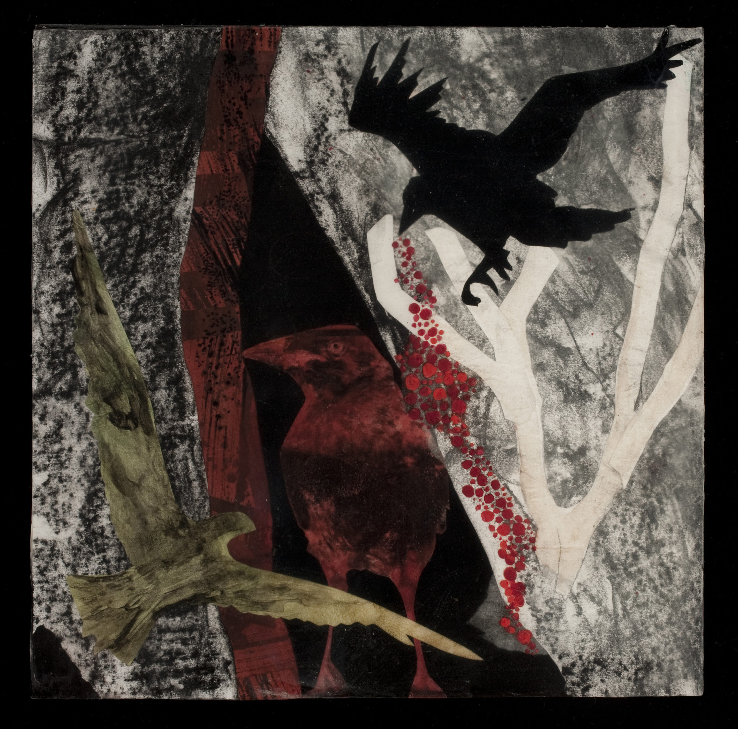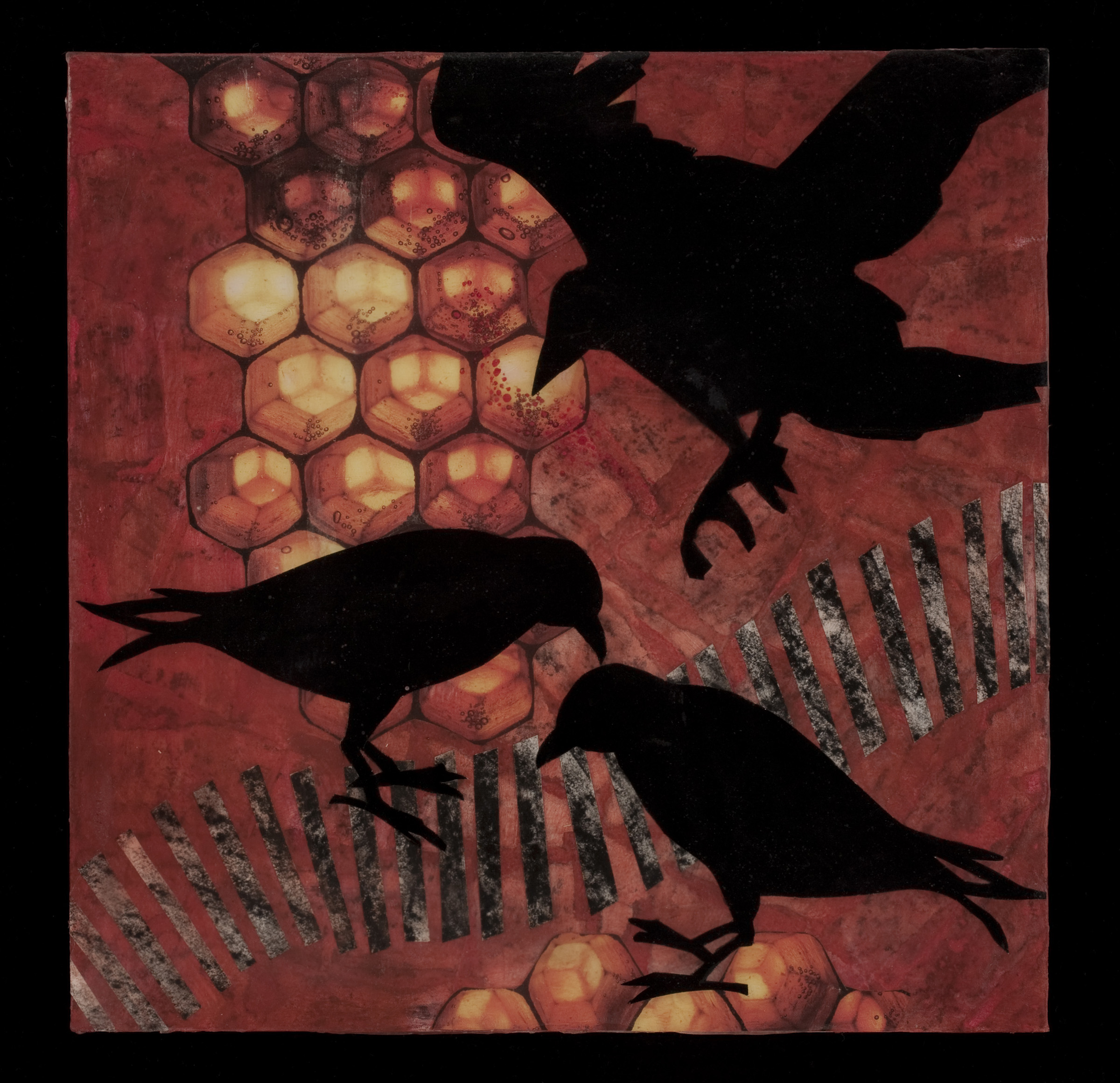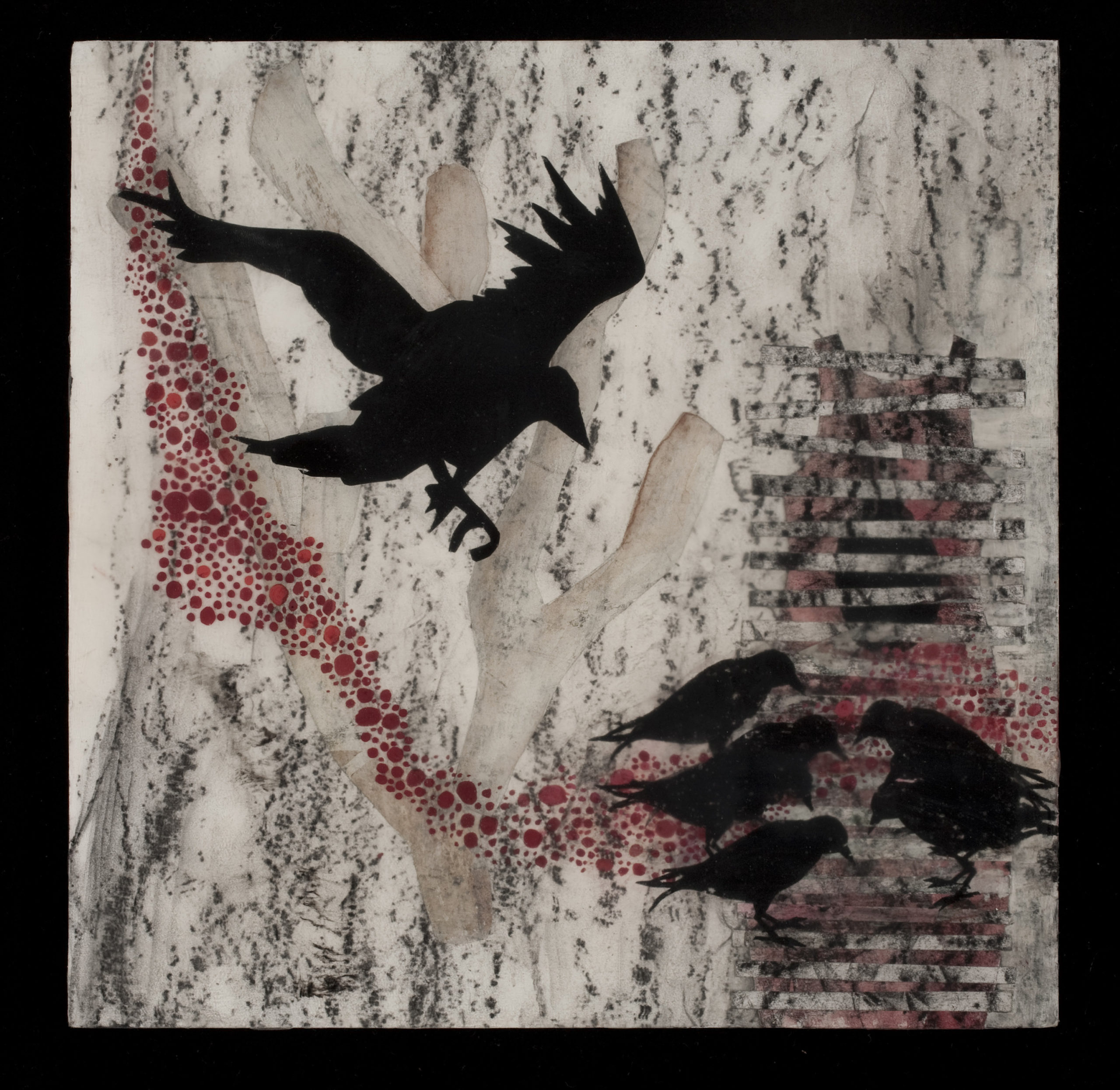 The life cycle of prey and preyed as a metaphor for human power games is at the heart of my current visual language and person symbology. I use robins and ravens to play out the struggle between the oppressor and the oppressed. I hope the viewer can find their own conflicted relationships or moments of feeling preyed upon in this imagery.