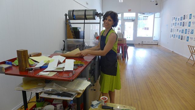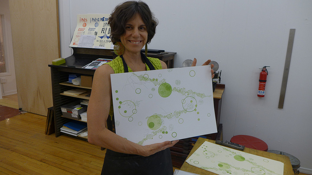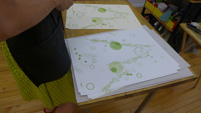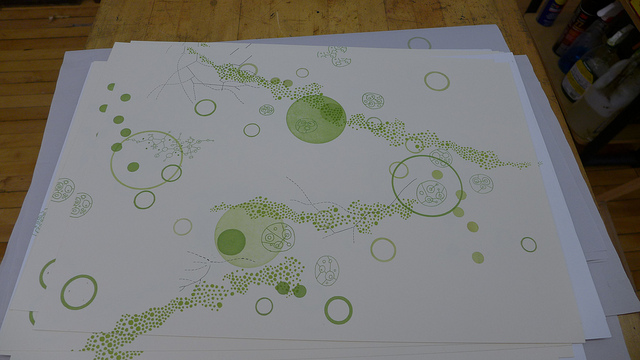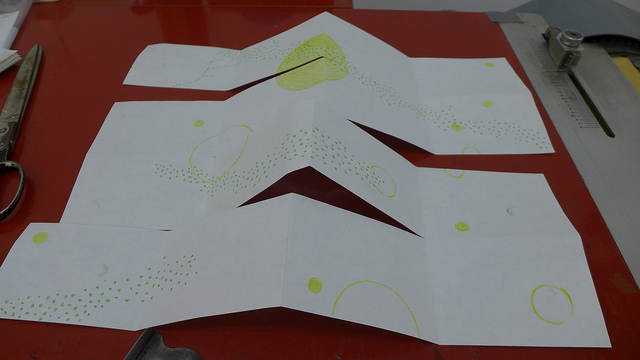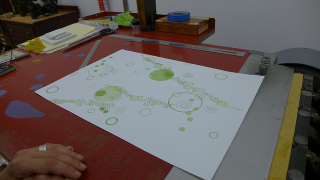 Lately I have entered printing bliss quite consistently. It’s a rush to get into that state. The entry is like having blinders lowered around my eyes, like horse blinders, allowing me to focus every neuron in my body on whatever it is I am doing. Recently it has been the creation of a maze book, a book for my Australian American mail exchange on the theme nucleus. A maze book is a book made from one piece of paper. You strategically cut and fold the paper so that the book folds down into an accordion of sorts. There are all sorts of different ways of making these fold-downs, one-page books, maze books. Pretty much anyone can make one, which is why they are really hard to do well. You’ll see the overall layout of this in the slideshow.