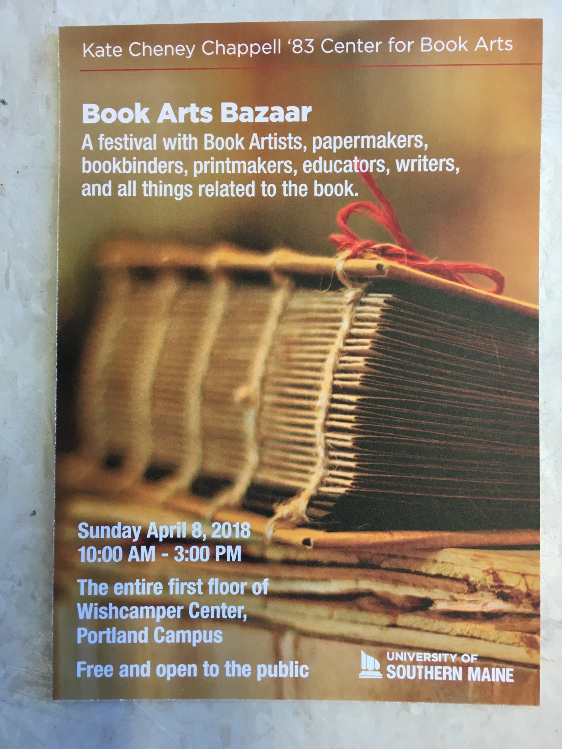 April 22, 2018Join me this weekend, where I will be exhibiting my work at the 7th Annual Book Arts Bazaar on the first floor of the Wishcamper Center on the Portland Campus of the University of Southern Maine. It’s a festival with Book Artists, papermakers, bookbinders, printmakers, educators, writers, and all things related to the book.