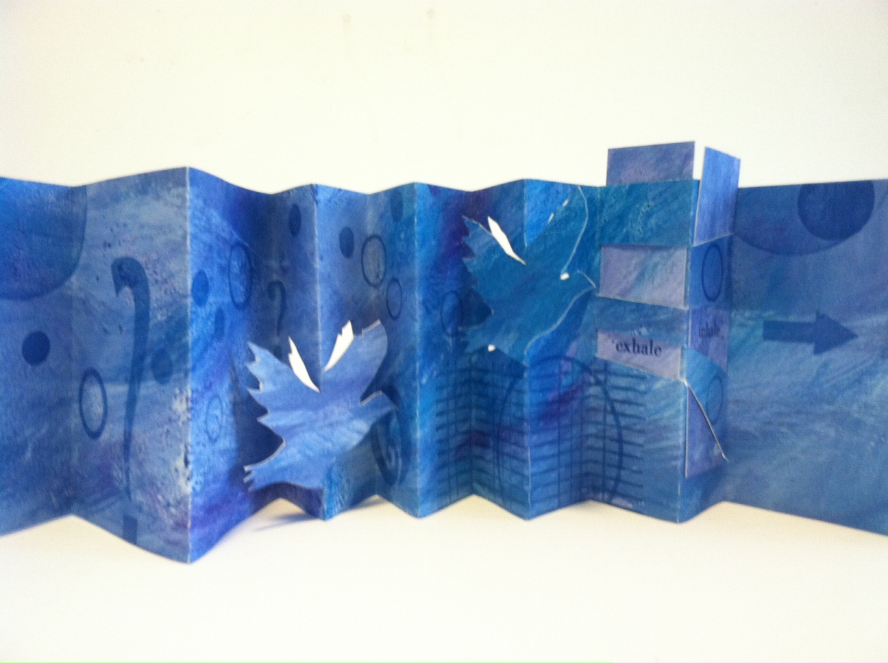 January 1, 2014Conspirare: Latin, verb. Meaning: to breathe together. Sometimes all a book needs is the right title. The images tell the story, and the title directs the experience. So how it went when making the book Conspirare. The book combines a simple accordion fold with pivoting panels and woven panels. Two birds form the pivoting panels. The words inhale and exhale are revealed when you play with the woven panels.