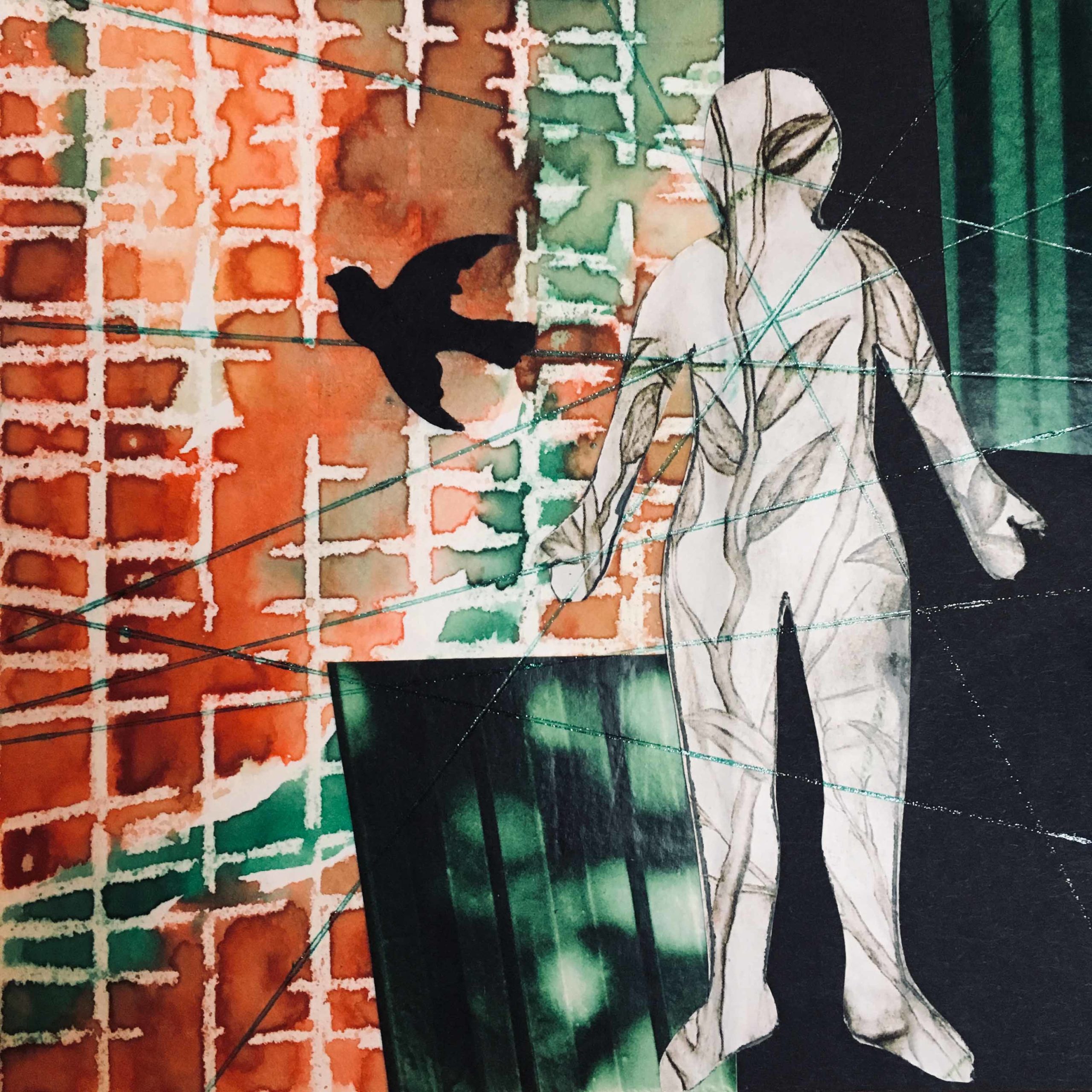 Likely you’ve noticed that I use an outline of the figure in many of my collages. Some of these are ones that I have drawn, others are from figures that I found in magazines which I trace onto other papers and incorporate into my work. For today, I want you to find such an image, something that has a strong silhouette, which will transfer nicely to any patterned paper. Use that patterned silhouette image to direct your work today.