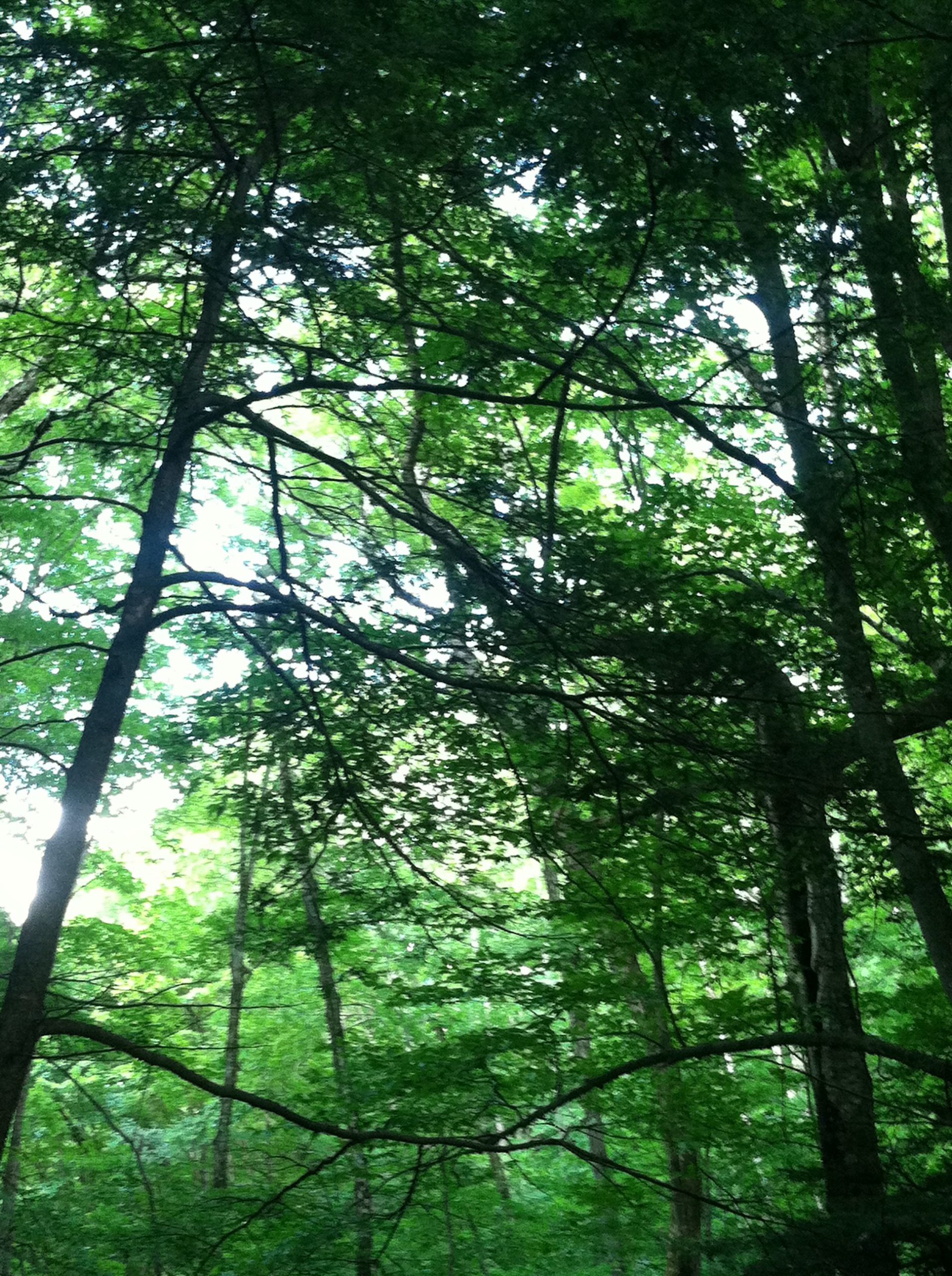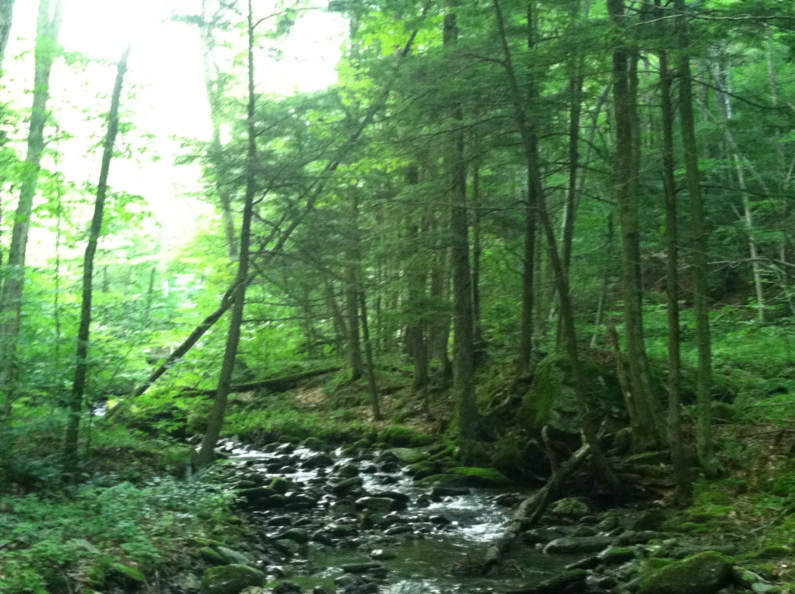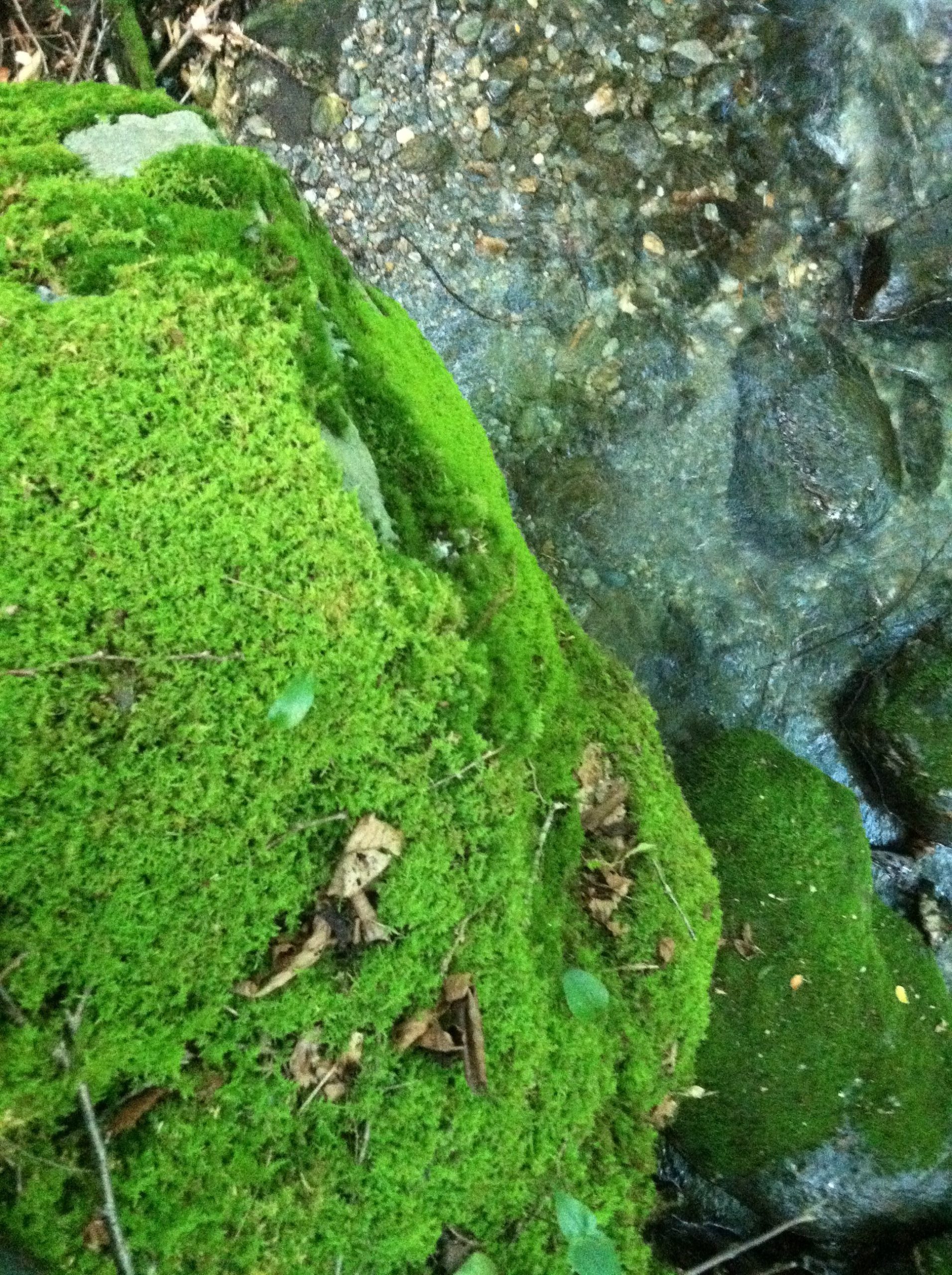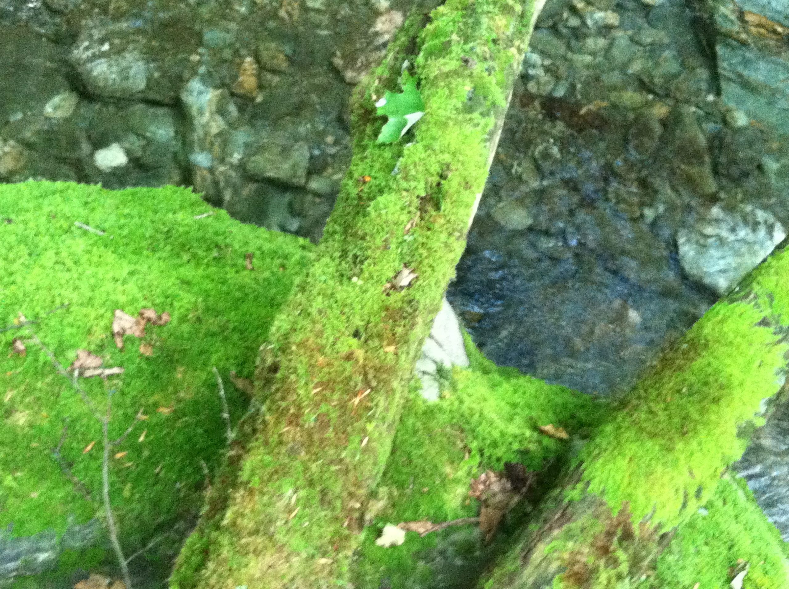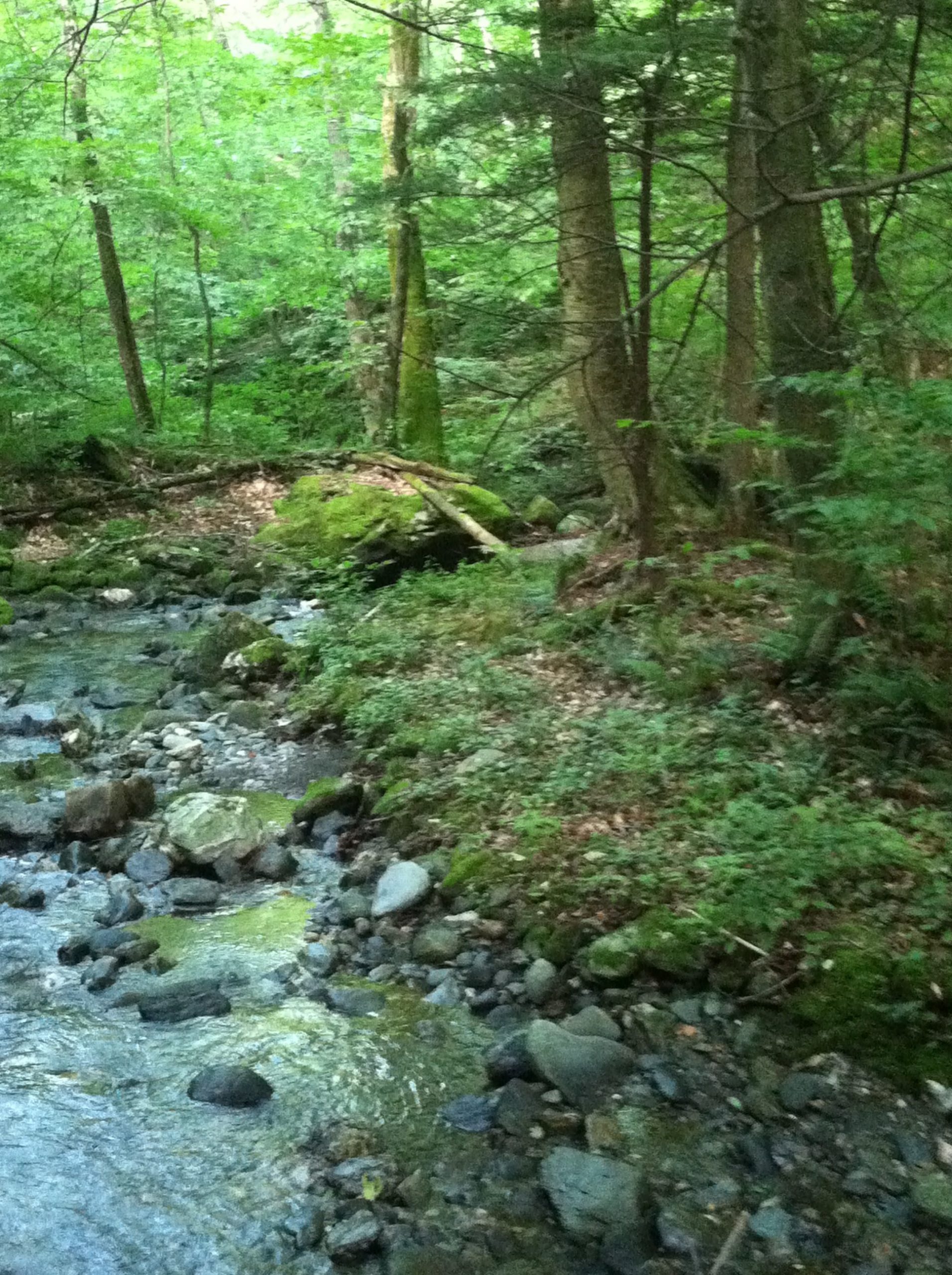 These woods pictures were taken about two miles into the woods from my house, right near a bridge that crosses Kitchen Brook, the stream that runs from a source high up Mount Greylock, through our woods and down the mountain into Cheshire Lake. This particular spot beckons me. Renders me to standstill. Invites me to come and sit, to listen to the babbles and the gurgles of the stream, quieting my mind–giving me the same peace of mind that walking in my labyrinth does.