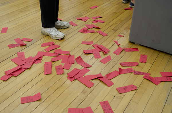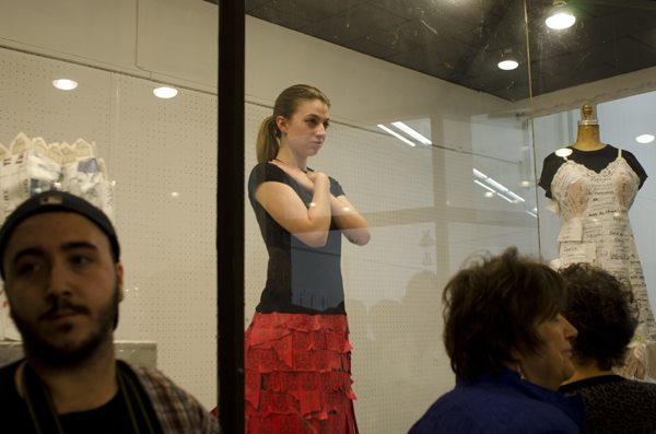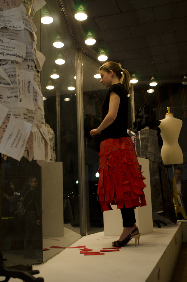 The performance began with all three young women walking into the gallery at various speeds and intensities, moving backward and forward and in and around people and artwork. After about 5-10 minutes of this, Courtney, who was wearing the Let Go dress stopped. Crysta and Kelsey then began inviting people to come and tear off the part of the let go strips written with various statements. Sometimes it was very easy to tear off the strips, at other times quite difficult. Once torn, they were to be left to the floor. Gone, having been let go. This went on for a few minutes then the young women returned to the starting movement before taking up positions in the window where they moved slowly for a little while until they were released.