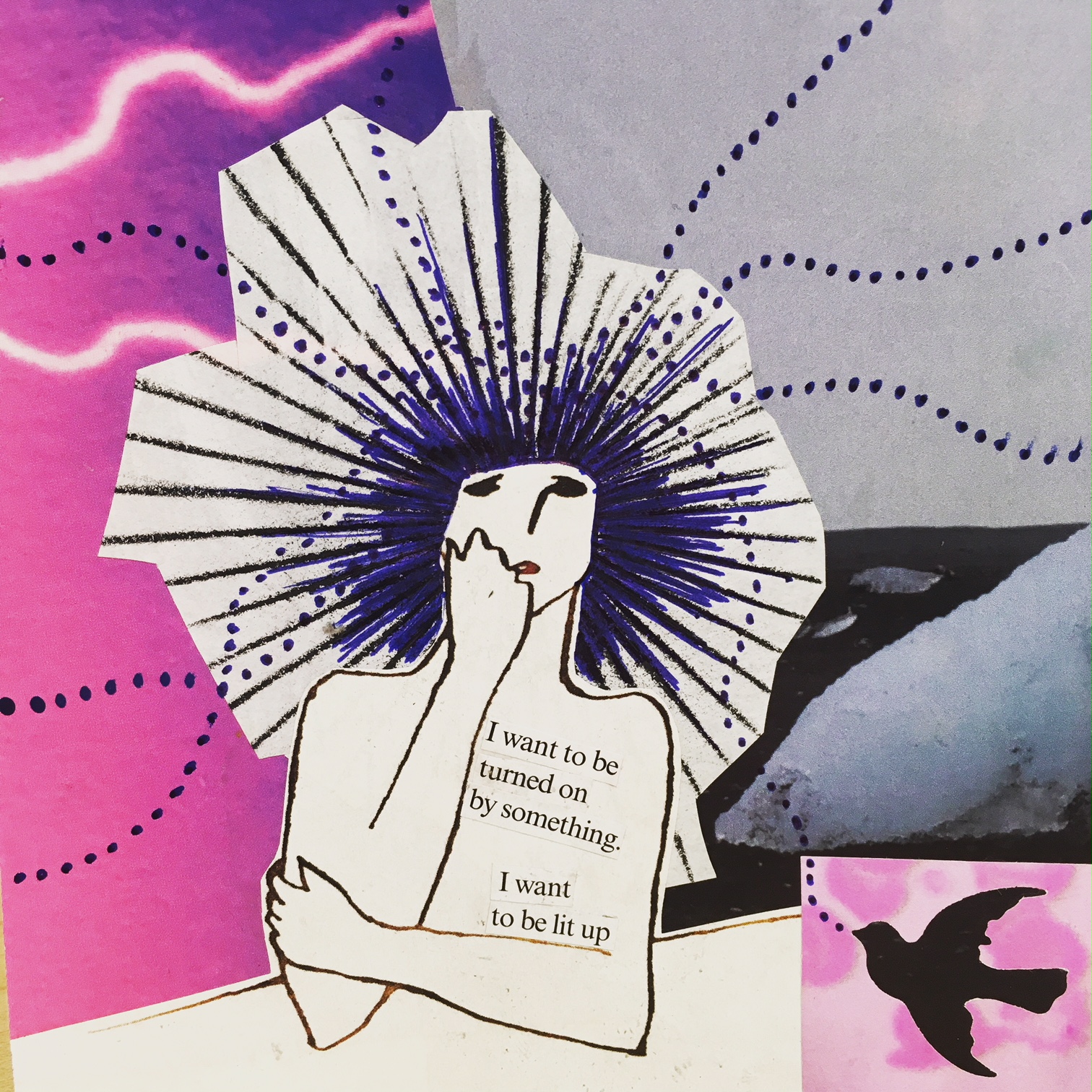 Use a figure as the focal point of your collage. Collage something that weaves in and out of the brain/skull area. Add mixed media if you like.