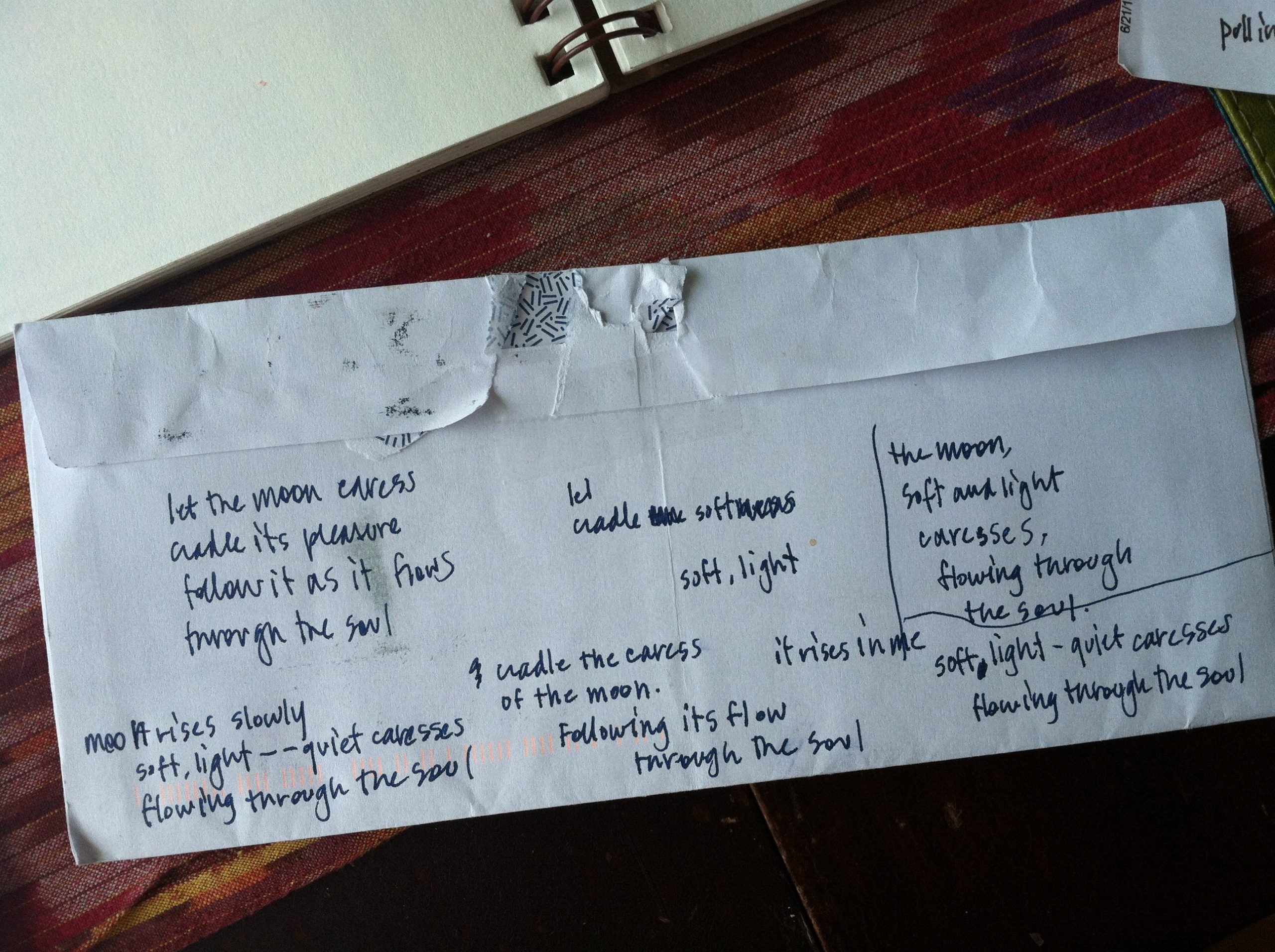 I wanted to print some sort of small text on it, my text. But I couldn’t find anything in my writings or journals that worked. So I asked a few people who came into the shop for ideas and went home Sunday night with summer, super moon, solstice and solid sound. I love alliterations. When generating text, I like to start with some key words, stream-of-conscious write for three minutes, then get to the hard work of honing it into something concrete.