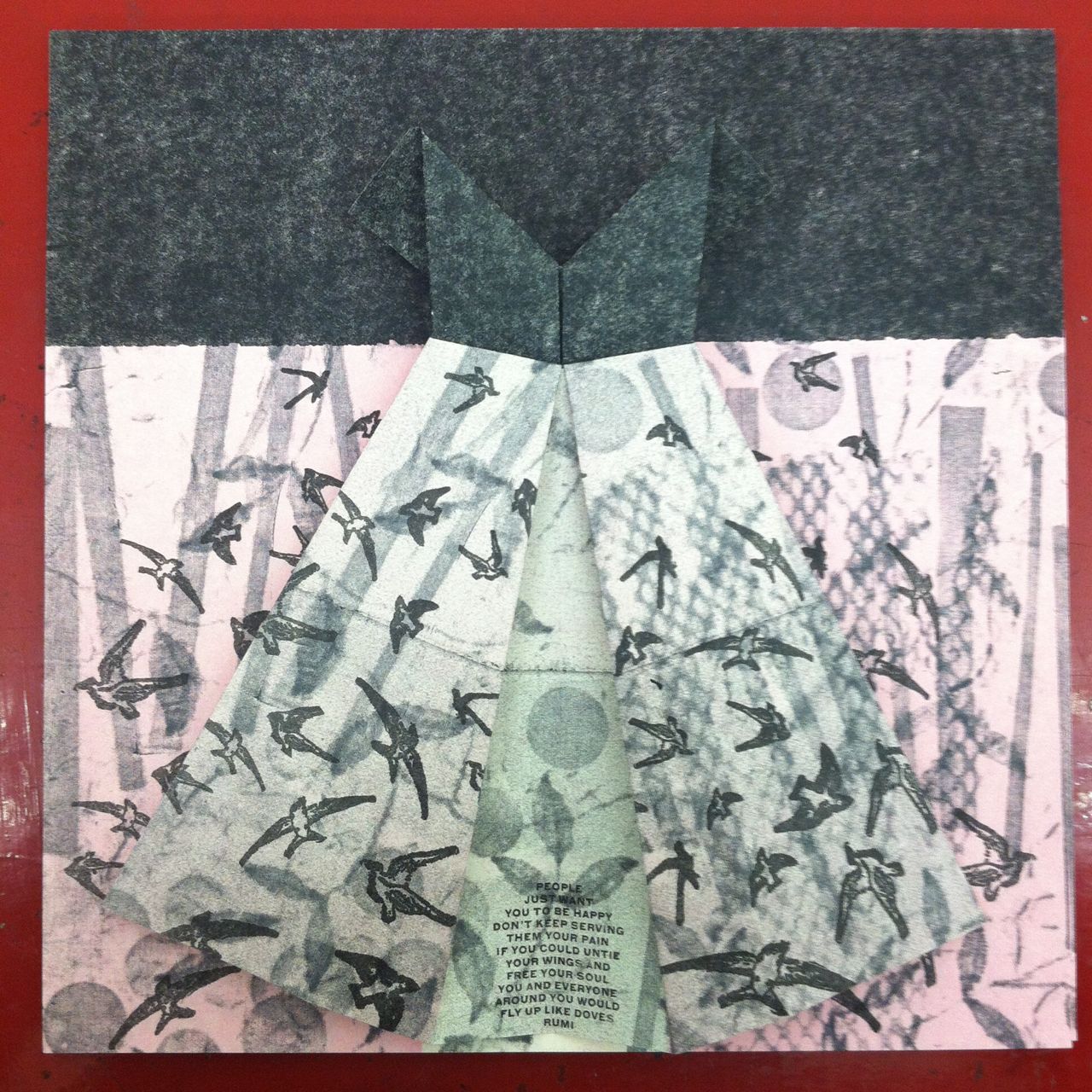 The design for me dress originally started out as my idea for my actual sized paper dress. Or a variation of it. But after many hours of pondering what I wanted to make–I envisioned the dress as a print–using layers of sandragraph, pressure prints, polymer plates and type to create this lovely little creation. I wanted the birds to be somewhat engulfed in the background to represent their need to get free and rise up into the unknown.