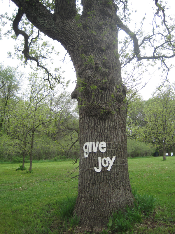 I am now in Nebraska City at the Kimmel Harding Nelson Center for the Arts (KHN) as a resident again, fulfilling a dream that began during that first residency to install my Paper Word project for Nebraska City’s Arbor Day celebration. In honor of that, fellow resident Erin Malone and KHN Program Director Amanda Smith (Thank you!) helped me install paper words at the Arbor Day Farm Tree Adventure. The words will also be on trees in front of the county courthouse and city hall.