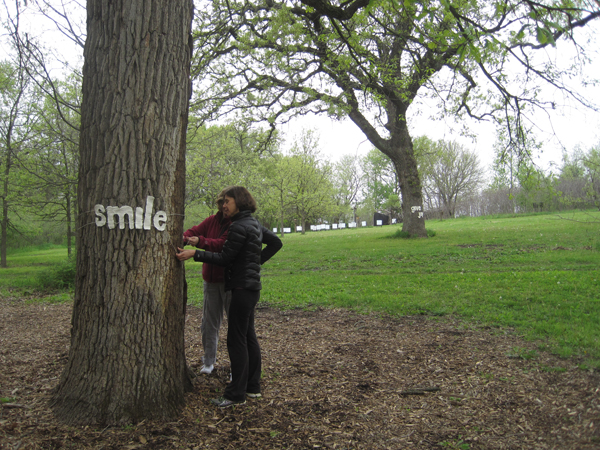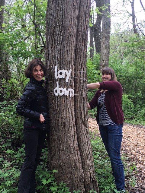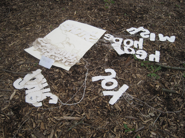Here’s a summary of the inspiration for this: Here, Stands is a collaboration between poet Holly Wren Spaulding and artist Melanie Mowinski that brings brief, image-driven poems to public spaces. Mowinski takes Wren’s words and her own and makes them into handmade paper words that are tied around trees. The spare, haiku-inspired texts bring attention to the many functions of the forest (utilitarian, emotional, spiritual, aesthetic). The project serves to engage passers-by with reflections having to do with humans’ relationship to the environment. Inspiration includes the forest monks of Southeast Asia who “ordain” trees by wrapping them in sacred monk’s robes in an ongoing effort to save endangered forests from industrial logging. Our project enrobes the trees in poems, another way of bringing awareness to their virtues, both sacred & mundane.