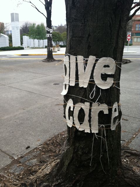 I’m completely enchanted by this concept–the way the white words glow against the dark bark, and the interruption in the visual environment. Does the (handmade?) paper eventually decompose from the weather or do you have to take the text down eventually? Did you sew the strings into the text? I love how they squiggle against the pavement like delicately drawn lines.