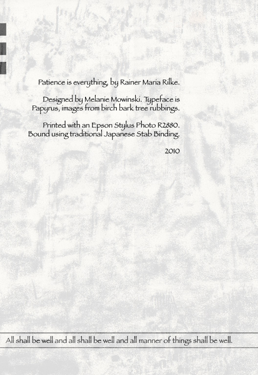 I made an example to go along with the workshop. It is found on the right, and opens from the back, at least for a western reader. Here are the images–very sparse, very quiet. OR, click on this link for the PDF experience of the book. Rilke_Asian_Binding