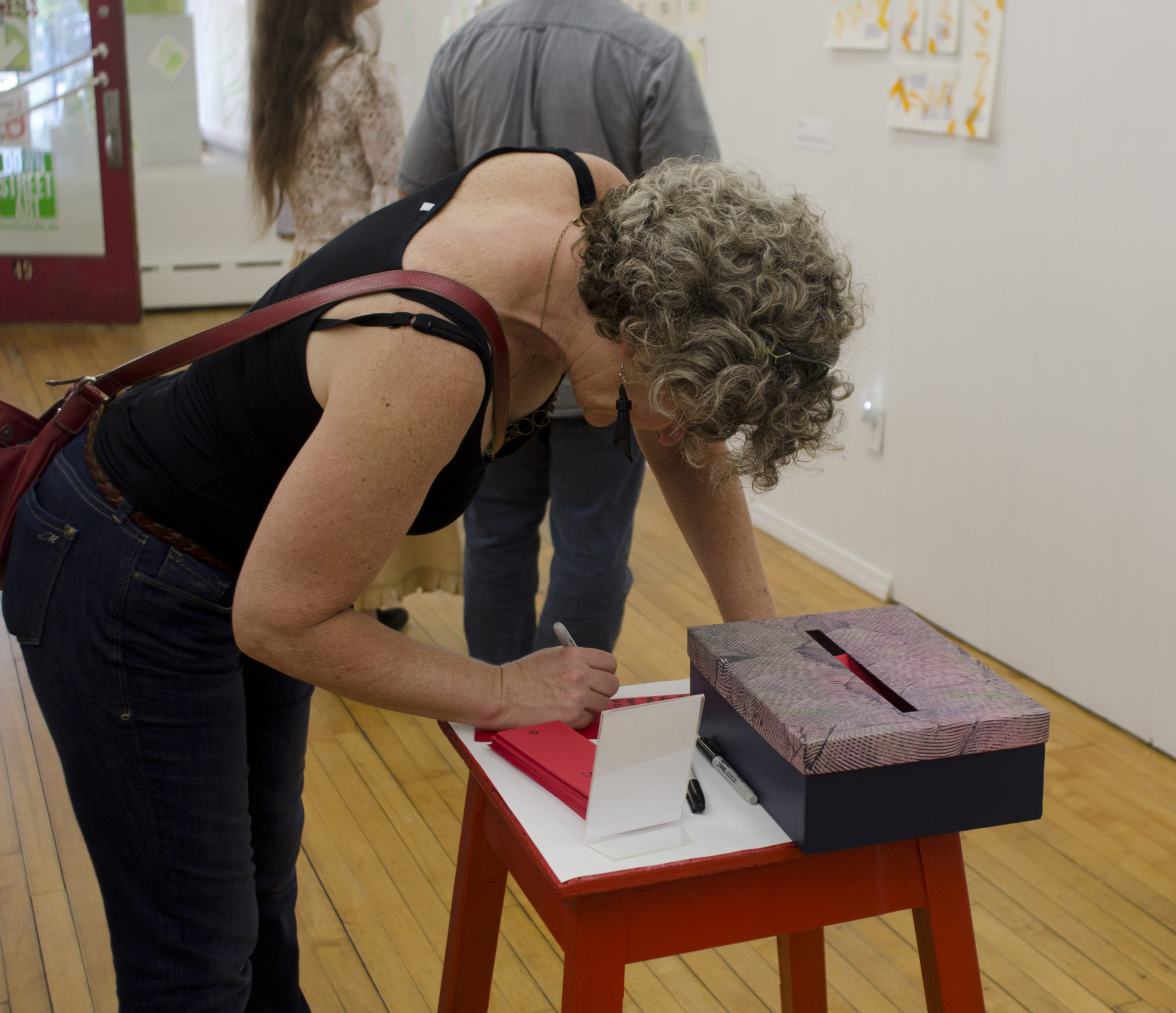 After the initial performance the objects that needed to be “let go” of were collected and contained in a clamshell box. Also contained in the box are additional “let go” papers for viewers to complete for future versions of the dress.