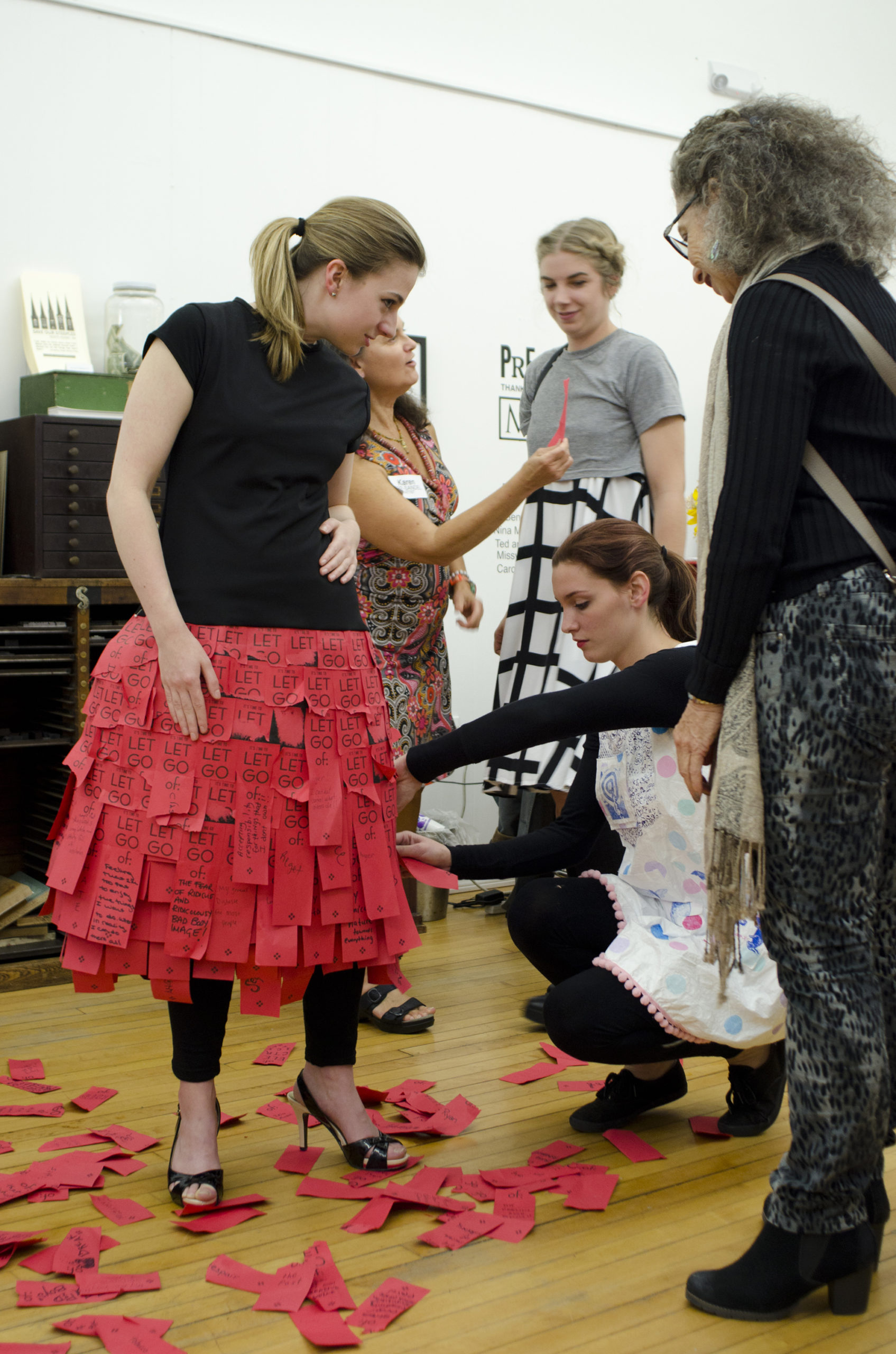 The Let Go Dress and Statement Collection consists of over 250 written statements on letterpress printed strips of red French paper. Each strip of paper is perforated below the words “let go” and fused to the skirt of a dress.