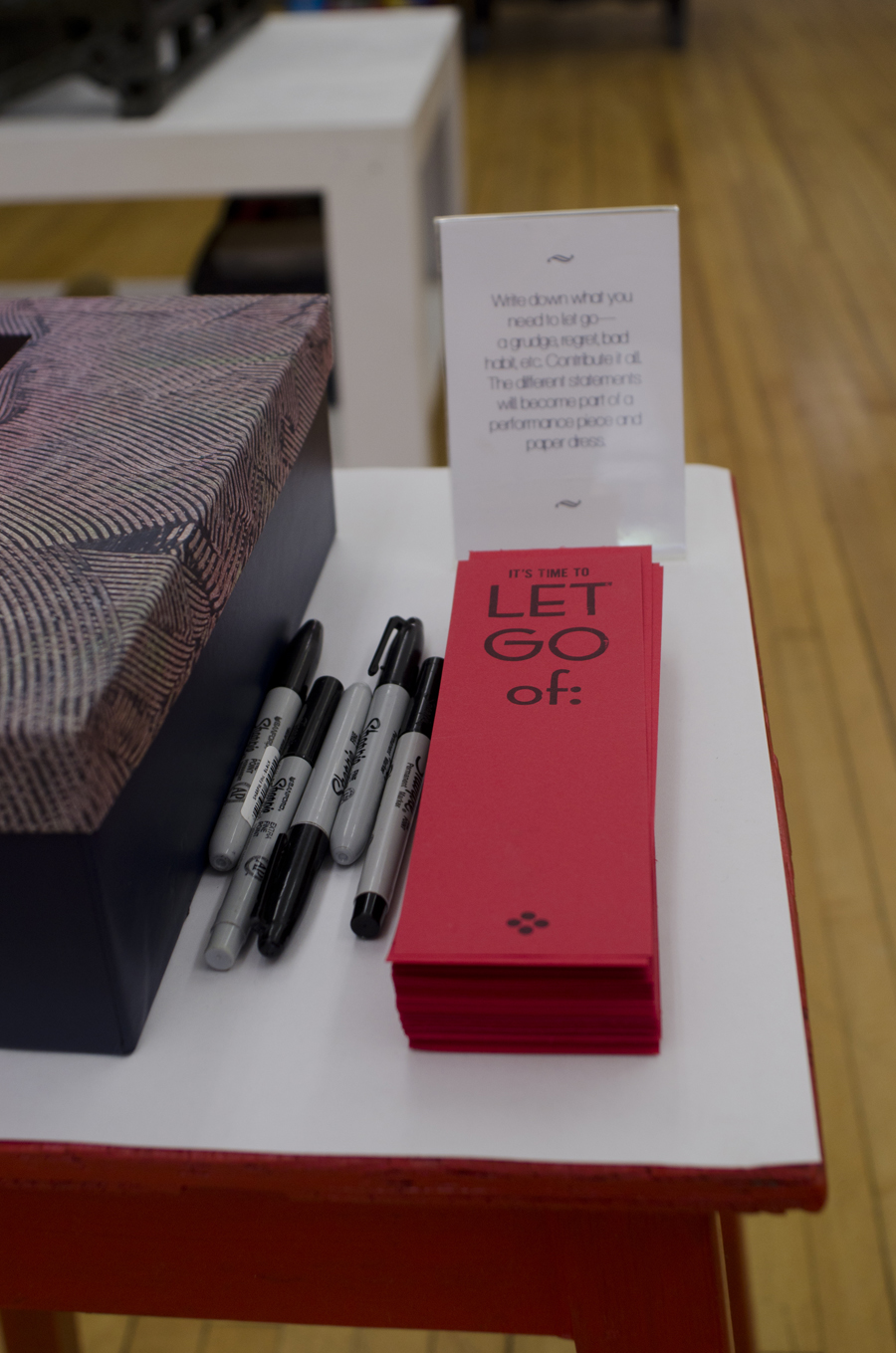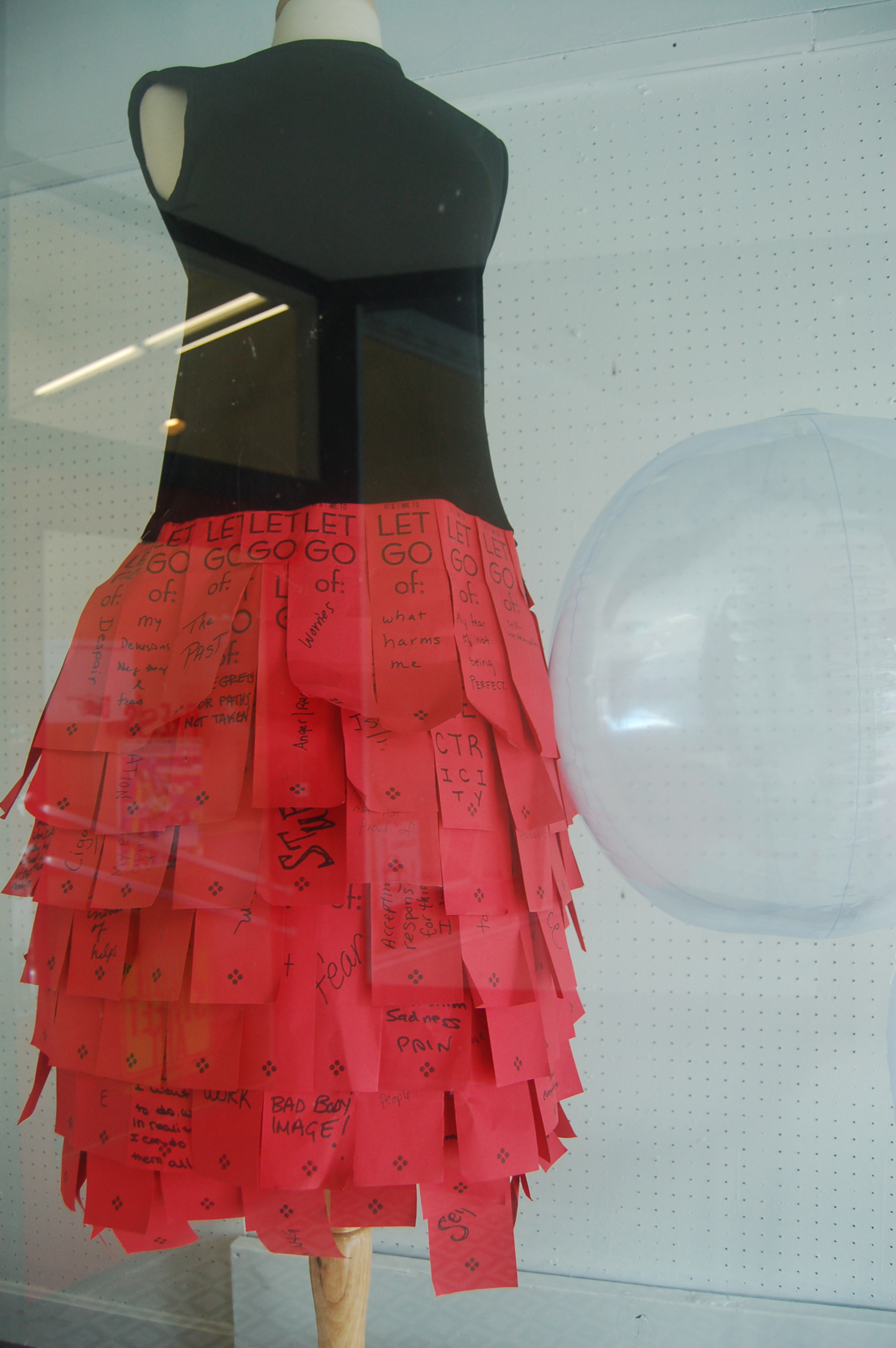Each let go paper was perforated below the words “let go” and attached to the skirt of a dress. The various “let go” statements were designed to be torn off the dress and left to the world, some of the papers were easy to tear off the skirt, others were more difficult. This is a reminder of how sometimes we need someone to help us let go, as well as that it is sometimes just really hard to let go…