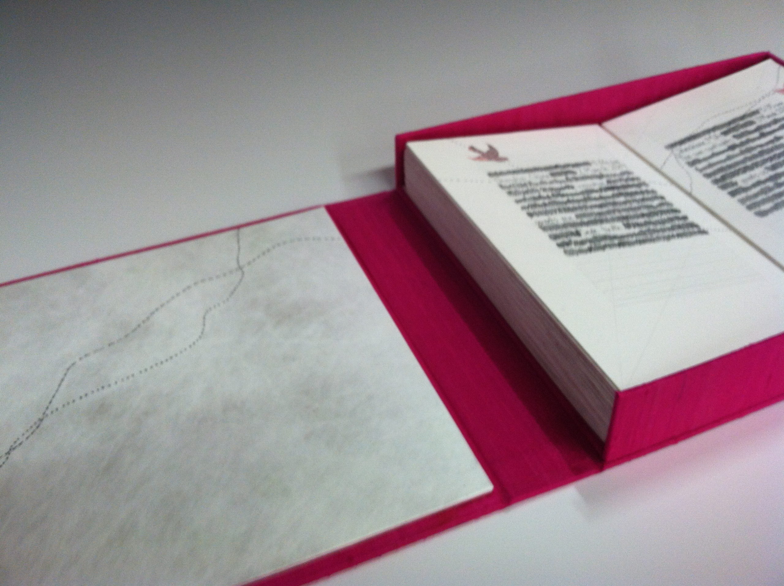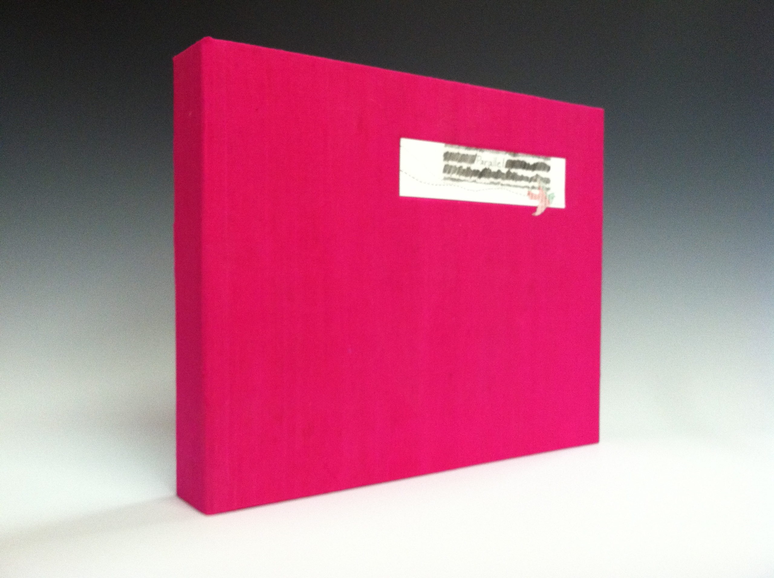 I used Crane 100% cotton paper—Marianne and I agreed to source paper locally. My paper is neutral in the sense that it is not pre-treated, printed, painted or otherwise. Of course, I did add something extra–a dyed-tyvek spine. And I used my favorite color–a bright, near fuchsia pink. More as a challenge–one of my friend’s recently commented on the fact that you don’t see pink in much art. So not only is pink part of this book, the book is housed in a pink clamshell box made from pink silk bookcloth that I made a few years ago.