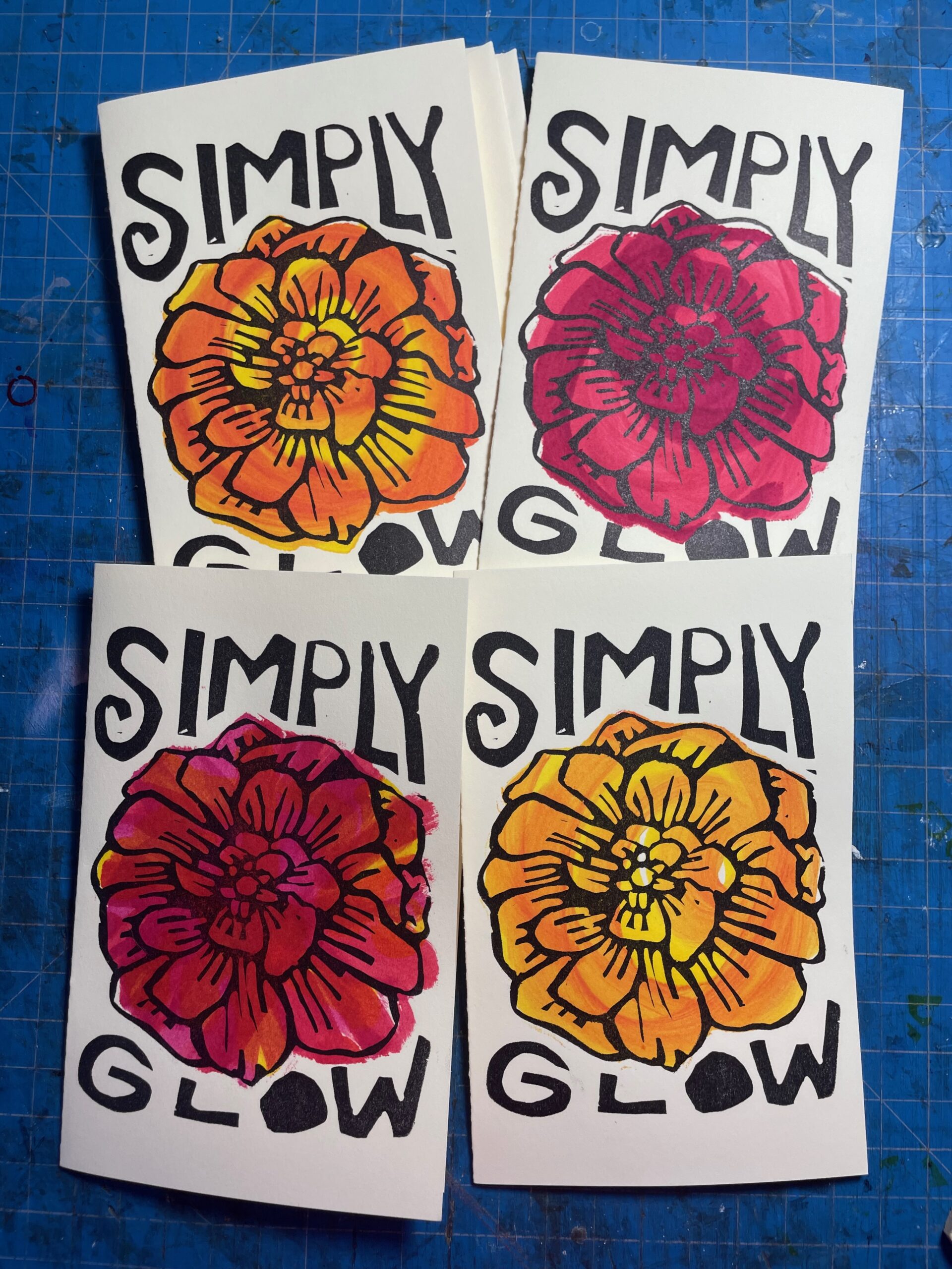 Each set comes with four different hand-colored marigold cards, and the Simply Glow statement.