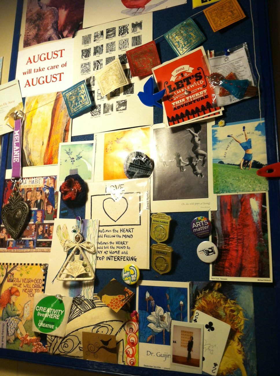 At my bench in my studio is a bulletin board filled with various cards and other things that inspire me. Some of these cards are over 10 years old. Some of the sentiments are even older, like the August will take care of August one. A dear relative said that to me when I was fretting about what I was going to do in August in March. And next to It’s fine it’s up there in my personal mantras.