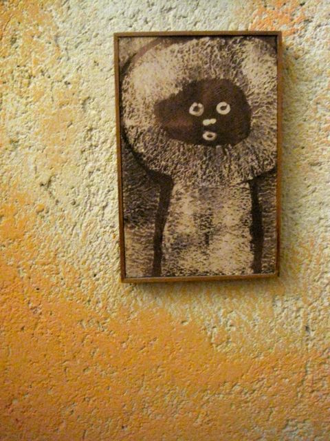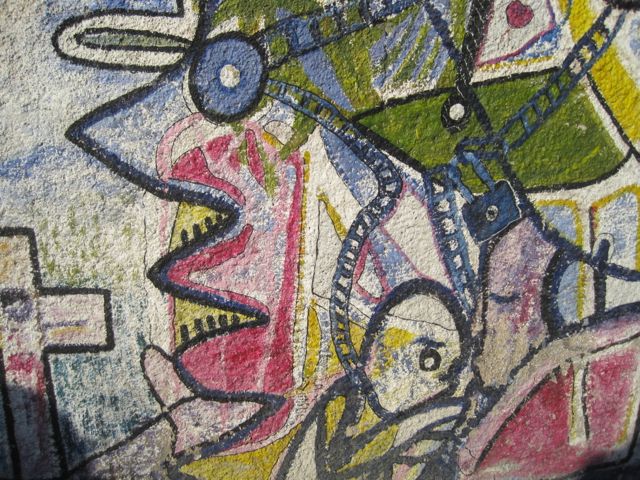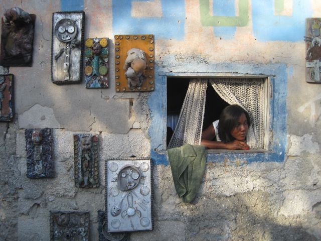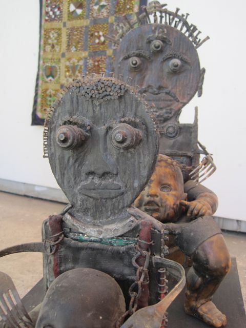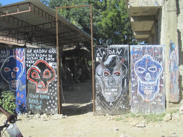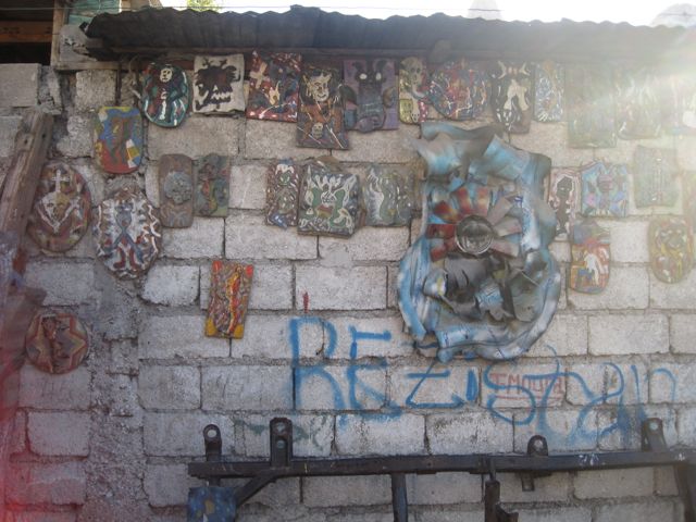Andre Eugene, one of the Grand Rue artists, is an internationally known artist who represented Haiti at the 2011 Venice Biennale and whose work has been compared to Damien Hirst of the diamond skull fame (both who stretch, on opposite ends, what no-budget art-making means). Eugene works with found skulls, as well as other materials that are on the streets. Yes, found skulls. Human skulls, that he finds on the street. He uses these and other materials that he finds to create his sculptures. This is the epitome of no-budget art making. But more important is the work that he lauds when you visit his studio, the work made by the children of the Grand Rue. He regularly works with them to teach them to find their way into that place of creativity, using similar techniques that he does, more because that is what they can afford–whatever they find on the street.