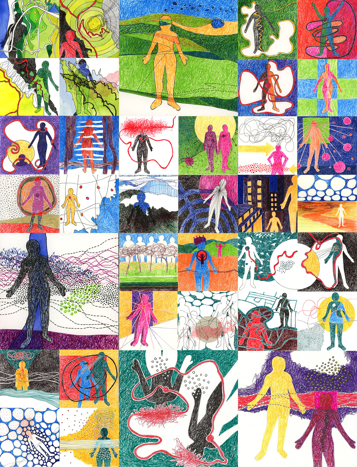 Last summer I traveled to northern California for a few days. I wanted to create something during my travels that went beyond diary writing and drawing. I combine map, memory, and observation with the figure. I continued making these figure drawings woven with landscape and observation when traveling to Ecuador in January. I like making these stencil figure drawings so much I decided to work on one everyday for #the100dayproject My goal was to create 20 by the end of the 100 days. I ended up creating 25. Pictured here are all of the drawings I’ve made from the initial California and Ecuador ones to the 25 made during #the100dayproject plus one more.