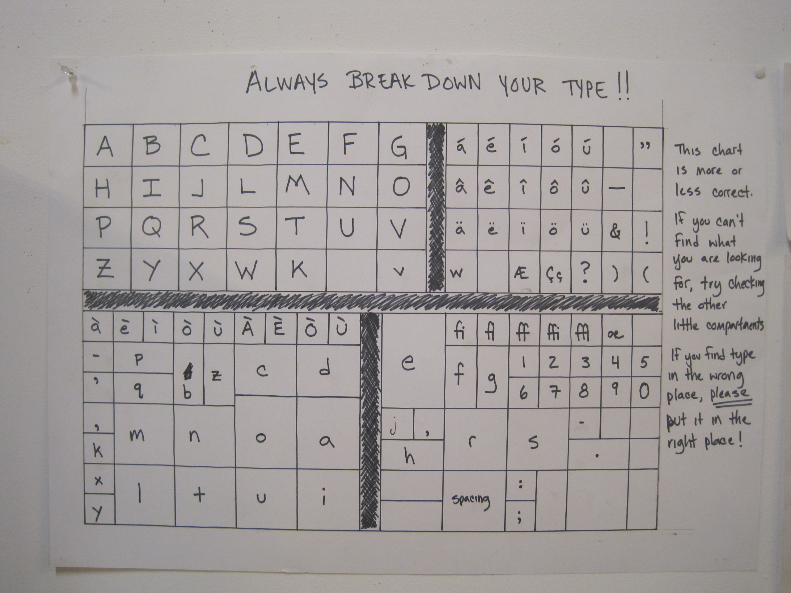 I am here on a fellowship at the Scuola Internazionale di Grafica. I came with the goal of using their letterpress equipment and all kinds of fun stories have come to me around the printing of Joseph Brodsky’s Watermark by Peter Koch at Scuola. Before I arrived an acquaintance of mine told me a bit about the story behind Koch’s printing of it, involving floating a Vandercook #4 down the Grand Canal to Scuola so he could print it there. Once I arrived, another resident told me about it again. This is the press I will be using. It feels like there is all kinds of good and crazy juju with this press, for the Watermark printing was quite an ordeal, or so I have heard. I am looking forward to seeing proofs of it…I’m hoping it’s in the Scuola archives. We shall see. And I had an LOL moment. This is the typecase layout: